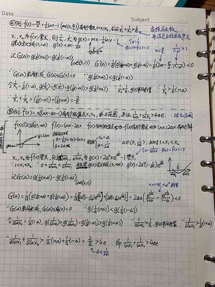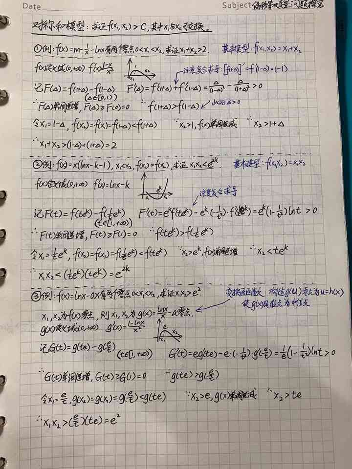 对数平均值结论不直接用于导数题的证明,但是证明对数平均值的方法可以作为证明导数题的思路。对数平均值的位置可以构造后转化为的函数求导加以证明,如证明对数平均大于几何平均: 。