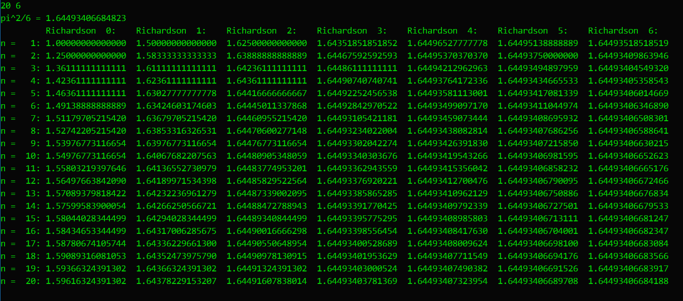 | #include <bits/stdc++.h> using namespace std; #define MAXN 100000 #define db long double #define PI 3.1415926535897932384626433832795 #define rint register int inline int rf(){int r;int s=0,c;for(;!isdigit(c=getchar());s=c);for(r=c^48;isdigit(c=getchar());(r*=10)+=c^48);return s^45?r:-r;} db A[MAXN+5], _; int n, K; long long C[16][16], fac[16]; inline db Richardson(int k, int n){_ = 0; for(rint j = 0; j <= k; _ += ((k-j)&1?-1:1)*C[k][j]*powl(n+j,k)*A[n+j], j++); return _/fac[k];} int main(){ for(rint i = C[0][0] = 1, j; i <= 15; i++) for(j = C[i][0] = 1; j <= 15; C[i][j] = C[i-1][j]+C[i-1][j-1], j++); for(rint i = fac[0] = 1; i <= 15; fac[i] = 1ll*fac[i-1]*i, i++); n = rf(); K = rf(); printf("pi = %.14Lf\n",(db)PI*(db)PI/6); for(rint i = 1; i <= n+K; A[i] = A[i-1]+(db)1/(1ll*i*i), i++); printf(" "); for(rint j = 0; j <= K; printf("Richardson %2d: ",j), j++); puts(""); for(rint i = 1, j; i <= n; i++) for(printf("n = %3d: ",i), j = 0; j <= K; printf("%.14Lf %c",Richardson(j,i),"\n "[j<K]), j++); return 0; }