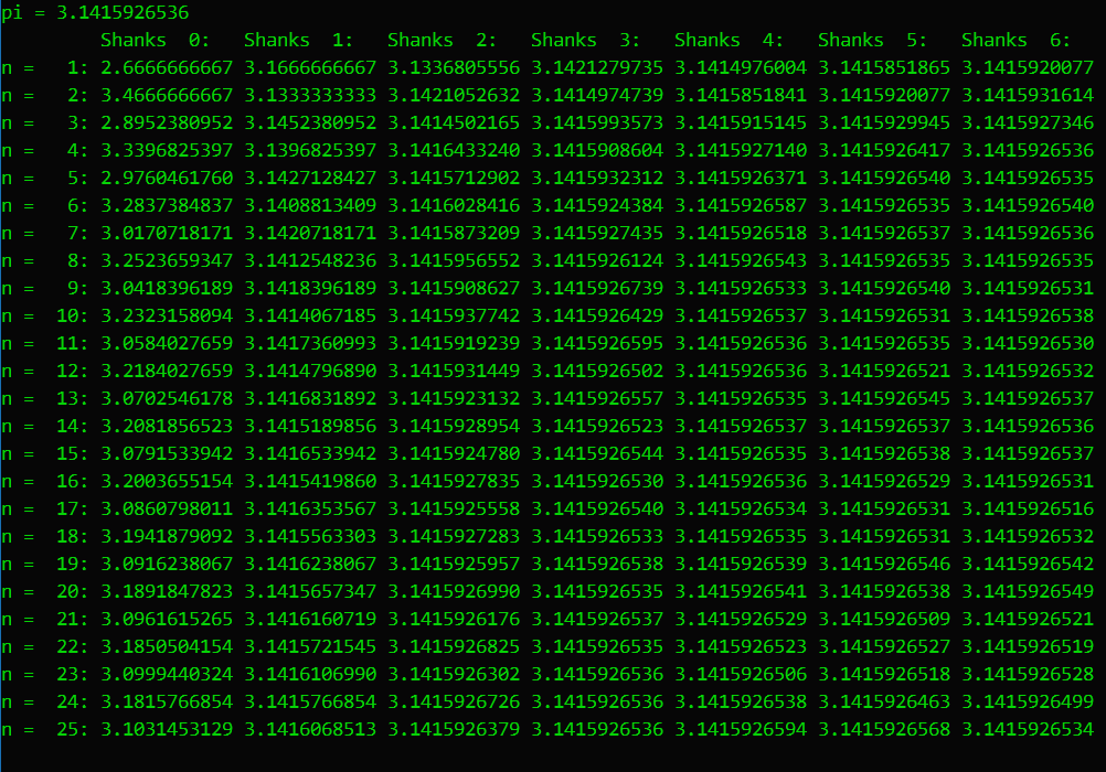 | #include <bits/stdc++.h> using namespace std; #define EPS 1e-15 #define MAXN 100000 #define db long double #define rint register int inline int rf(){int r;int s=0,c;for(;!isdigit(c=getchar());s=c);for(r=c^48;isdigit(c=getchar());(r*=10)+=c^48);return s^45?r:-r;} db A[16][MAXN+5], _; int n, K; inline db Shanks(db a, db b, db c){return _=2*b-a-c,fabs(_)>EPS?(b*b-a*c)/_:b;} int main(){ n = rf(); K = rf(); A[K][0] = 1; printf("pi = %.10Lf\n",(db)3.1415926535897932384626433832795); for(rint i = 1; i <= n+K; A[K][i] = A[K][i-1]+(db)(i&1?-1.:1.)/(i<<1|1), i++); for(rint j = K-1, i; ~j; j--) for(i = 1; i <= n+j; i++) A[j][i] = Shanks(A[j+1][i-1],A[j+1][i],A[j+1][i+1]); printf(" "); for(rint j = 0; j <= K; printf("Shanks %2d: ",j), j++); puts(""); for(rint i = 1, j; i <= n; i++) for(printf("n = %3d: ",i), j = K; ~j; printf("%.10Lf%c",4*A[j][i],"\n "[!!j]), j--); return 0; }