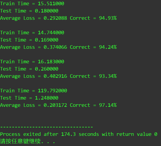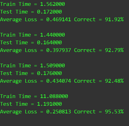 | void Run(NeuralNetwork &NN){ Read("train"); T0 = clock(); for(int j = 0; j < 10; j++) for(int i = 1, _, x, y; i <= n; fill(NN.Ans.begin(),NN.Ans.end(),0), NN.Ans[I[i].l] = 1, NN.Run(), NN.Adjust(), i++) for(_ = x = 0; x < 28; x++) for(y = 0; y < 28; NN.In[_++] = I[i].p[x][y]/256., y++); T = clock(); printf("Train Time = %.6lf\n",(db)(T-T0)/CLOCKS_PER_SEC); Read("t10k"); T0 = clock(); Loss = 0; Score = 0; for(int i = 1, _, x, y; i <= n; fill(NN.Ans.begin(),NN.Ans.end(),0), NN.Ans[I[i].l] = 1, NN.Run(), Loss += NN.CELoss(), Score += NN.Judge()==I[i].l, i++) for(_ = x = 0; x < 28; x++) for(y = 0; y < 28; NN.In[_++] = I[i].p[x][y]/256., y++); T = clock(); printf("Test Time = %.6lf\n",(db)(T-T0)/CLOCKS_PER_SEC); printf("Average Loss = %.6lf Correct = %.2lf%%\n\n",Loss/n,Score/n*100); }