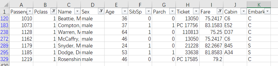 某次运行Python程序得到少量NaN输出结果于是发现在Excel中筛选或用pandas的isnull()函数检查发现,训练集登船港口数据有2人缺失。登船港口应该会和什么有关呢?个人感觉登船港口不同可能导致里程不同,从而影响票价,发现缺失数据的人票价都为。同时为了控制变量,性别、船票等级都会影响票价,因此筛选所有票价在之间的男性头等舱船票。