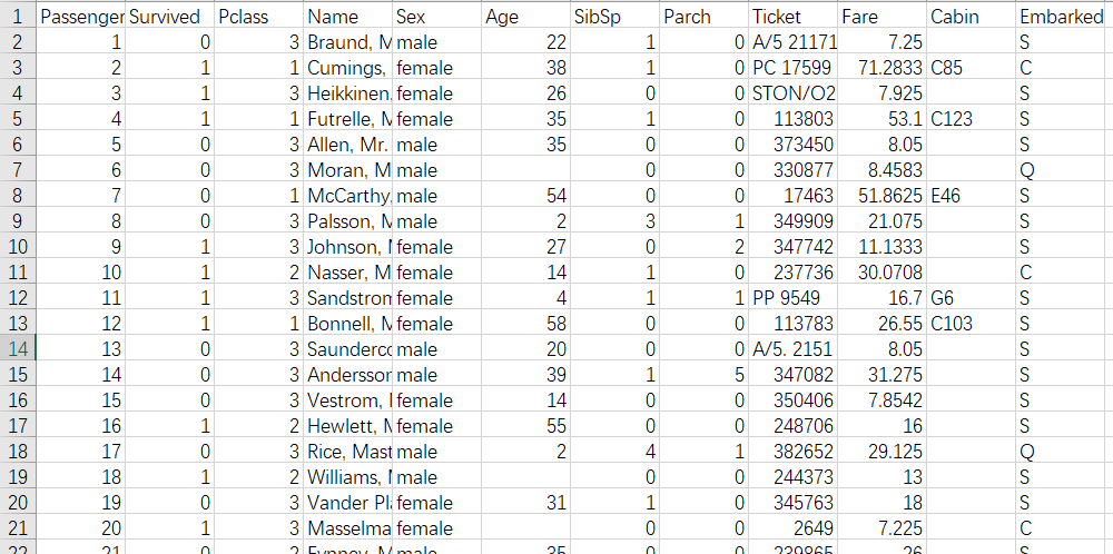 观察一下,主观臆断初步分析和感觉可以得出: 乘客编号(PassengerId)应该是完全没用的信息;姓名(Name)似乎和存活关系也不大;船票号(Ticket)由于数据太杂乱了,有用,但是应该会很麻烦;如果知道泰坦尼克号每个隔间的位置以及逃生通道的位置,隔间号(Cabin)应该是非常重要的信息,然而数据缺失特别严重,这意味着将其作为重要标准会有问题。